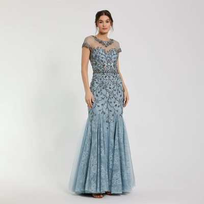 Blue Embellished Lace Evening Gown with Illusion Neckline