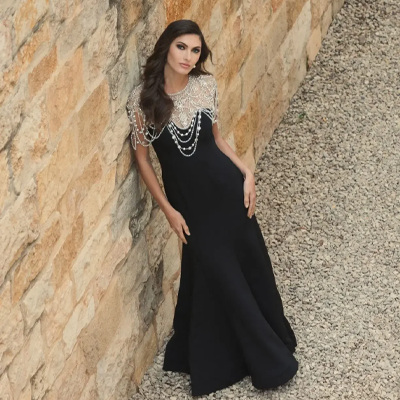 Black Draped Pearl Beaded Mermaid Gown