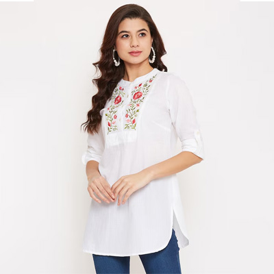 White & Navy Blue Pure Cotton Geometric Self Design Tunic