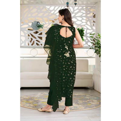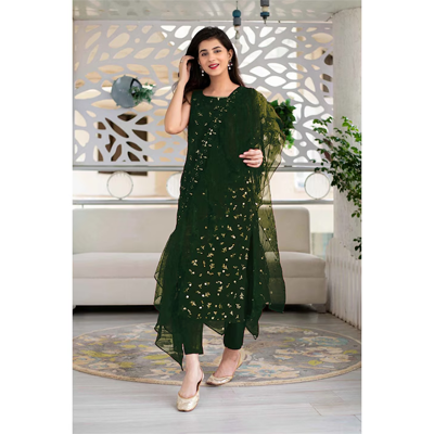 "Green embroidered semi-stitched dress material Green embroidered kurta fabric Green solid bottom fabric Green embroidered dupatta, has Disclaimer: Images are for referral purposes only. The actual product is semi-stitched Size & Fit Top fabric length: Bottom fabric length: Dupatta length: 2 metres (approx) Material & Care Top Fabric : Fox Georgette Bottom Fabric : Creap Duptta Fabric : Net Inner Fabric : Creap Wash Care: Dry clean for the first wash, there after hand wash"
