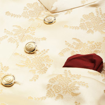 "Beige and maroon sherwani set Beige woven design sherwani, has a mandarin collar, a full button placket, long sleeves, straight hem, and multiple slits Maroon solid kurta, has a mandarin collar, half button placket, long sleeves, a straight hem, and side slits Beige solid churidar has a drawstring closure Comes with a pocket square Size & Fit Regular Fit The model (height 6"") is wearing size M Material & Care Cotton Dry Clean"
