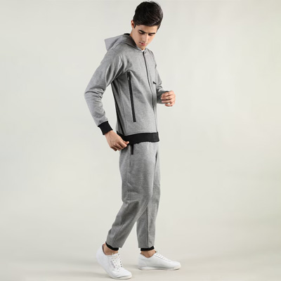 "Light grey Solid tracksuit Light Grey Solid track jacket, has a hooded neck with zip closure, two pockets and long sleeves A pair of light grey Solid mid-rise track pants, has an elasticated waistband with a slip-on closure Size & Fit The model (height 5'8"") is wearing a size S Material & Care Fleece Machine wash Do Not Bleach"