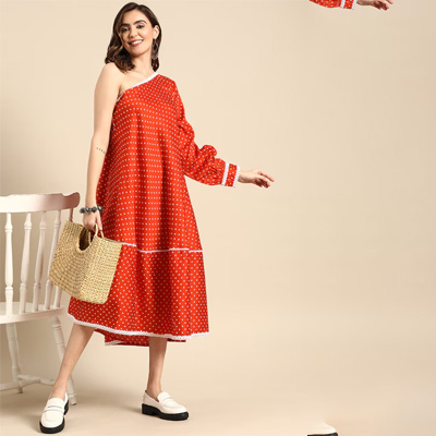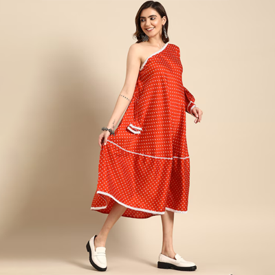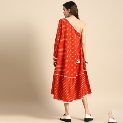 "Rust and white polka dot print fit & flare dress One shoulder Long, regular sleeves Knee length length in flared hem Size & Fit Size worn by the model: S Chest: 30"" Waist: 24"" Hips: 36"" Height: 5'6"" Material & Care TOP: Cotton Blend Dry Clean"