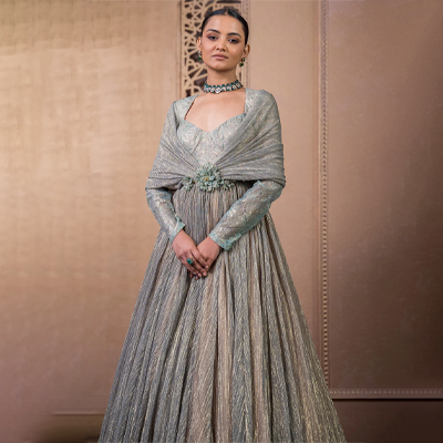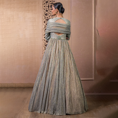 Our sculpted draped gown in a metallic crinkle tulle fabric is designed in a cape style.
