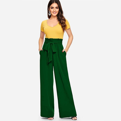 "Green knitted palazzos Solid Opaque Wide leg fit Length: regular Knitted polyester fabric Size & Fit Wide Leg fit The model (height 5'8) is wearing a size S Material & Care Material: Crepe Machine Wash"