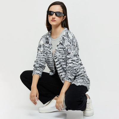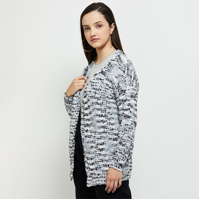 "Grey and white printed open front regular shrug ,has three-quarter sleeves, straight hem Size & Fit The model (height 5'8) is wearing a size S Material & Care 40% Polyester & 60% Accrylic Machine Wash"